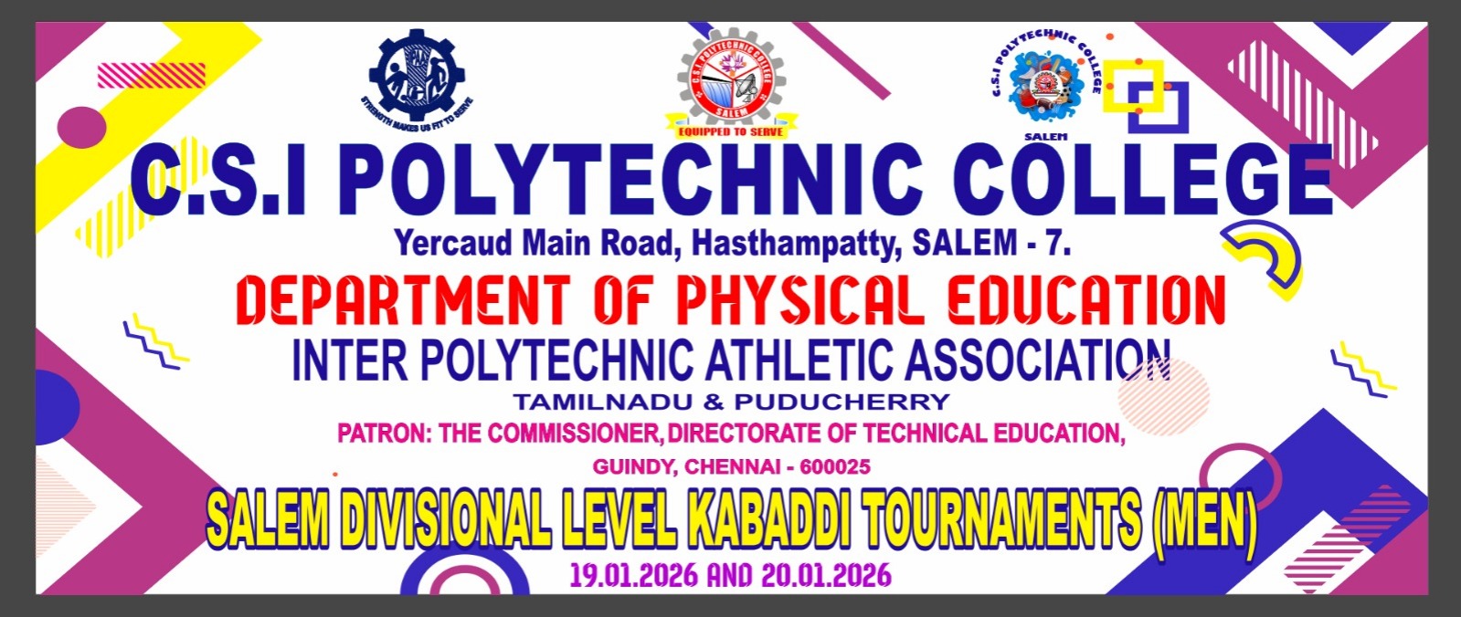 நமது கல்லூரியில் ஐ பி எ எ சேலம் மண்டல -யில் கபடி பெண்களுக்கான போட்டி 27.01.2026 அன்று நடைபெற்று முடிந்தது அதில் சி ஸ் ஐ பாலிடெக்னிக் கல்லூரி கபடி அணி முதல் இடத்தை பிடித்து கோப்பையை கைப்பற்றியது.வெற்றி பெற்ற மாணவர்களை கல்லூரி தாளாளர், முதல்வர், துறை தலைவர்கள்,ஆசிரியர்கள், உடற்கல்வி பொறுப்பாளர், மாணவ- மாணவி அனைவரும் வாழ்த்துக்களையும் நன்றியும் தெரிவித்தனர்.